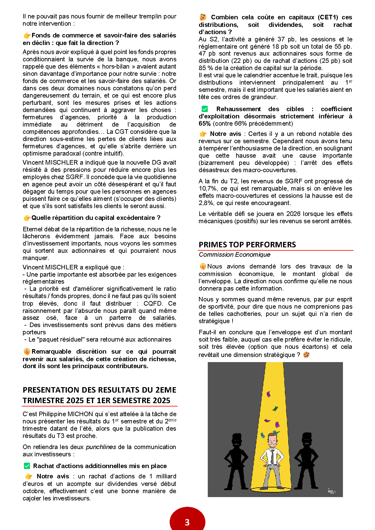 - La priorité est d'améliorer significativement le ratio résultats / fonds propres, donc il ne faut pas qu’ils soient trop élevés, donc il faut distribuer : CQFD. Ce raisonnement par l’absurde nous paraît quand même assez osé, face à un parterre de salariés.
