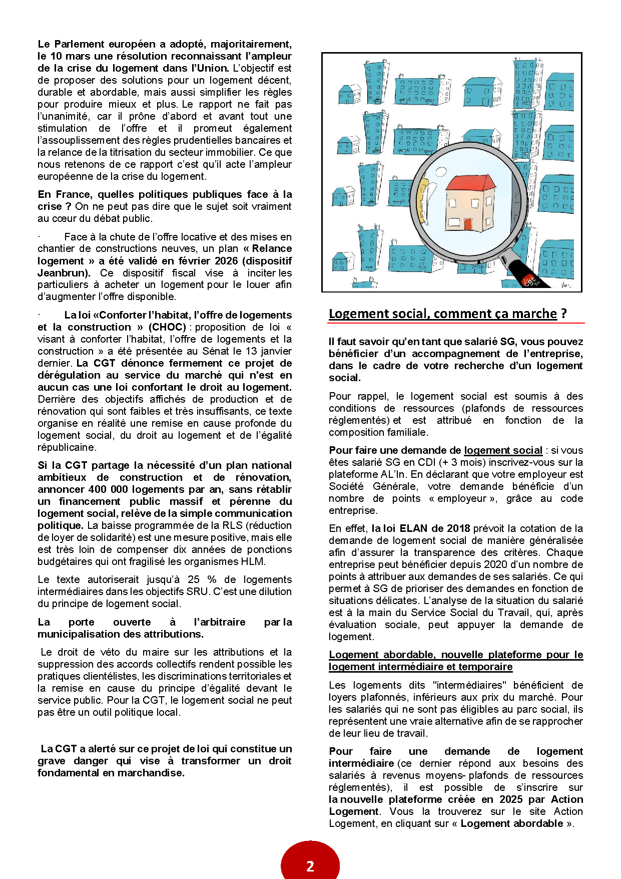 · La loi « Conforter l’habitat, l’offre de logements et la construction » (CHOC) : proposition de loi « visant à conforter l’habitat, l’offre de logements et la construction » a été présentée au Sénat le 13 janvier dernier. La CGT dénonce fermement ce projet de dérégulation au service du marché qui n'est en aucun cas une loi confortant le droit au logement. Derrière des objectifs affichés de production et de rénovation qui sont faibles et très insuffisants, ce texte organise en réalité une remise en cause profonde du logement social, du droit au logement et de l’égalité républicaine.