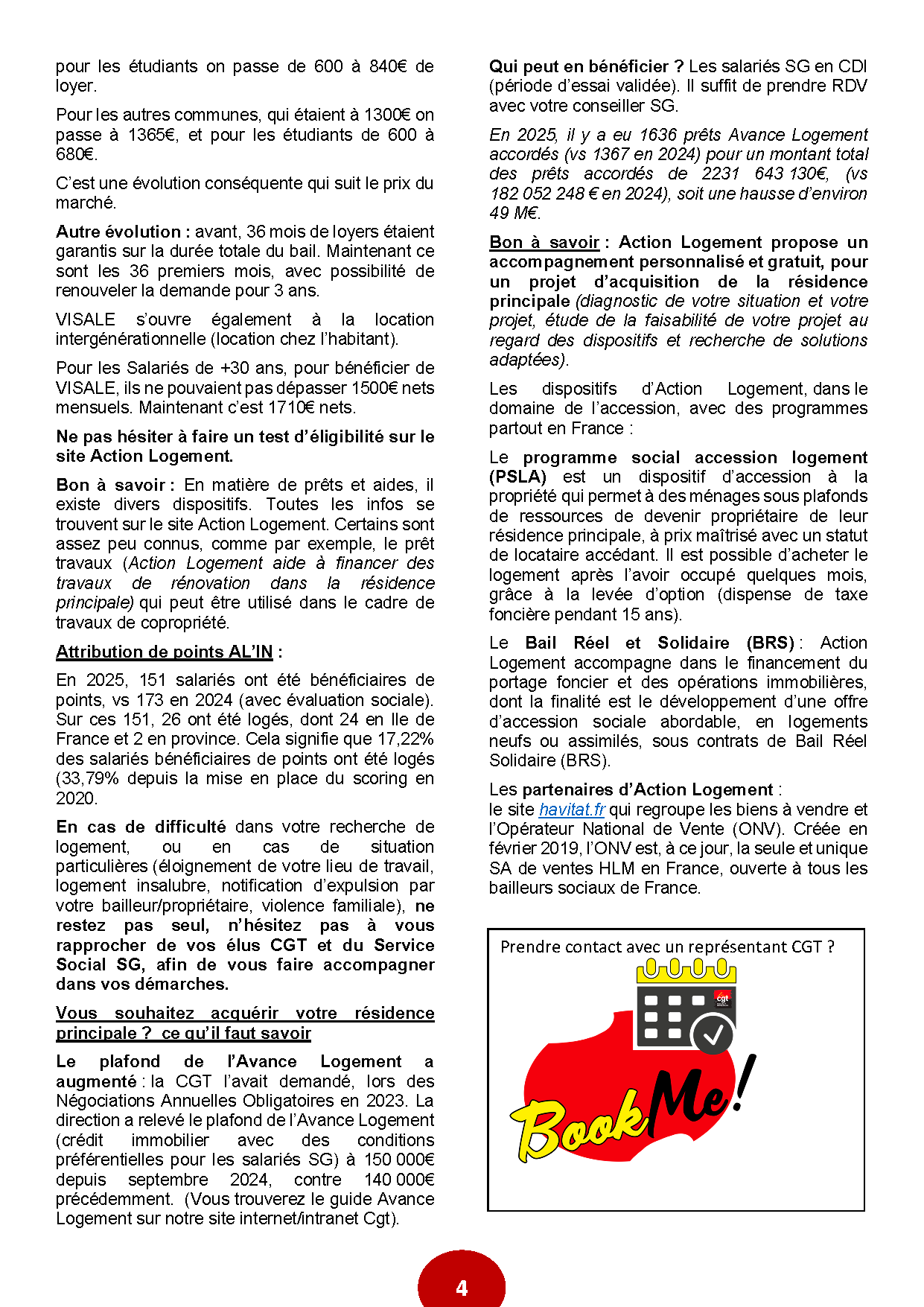 Le plafond de l’Avance Logement a augmenté : la CGT l’avait demandé, lors des Négociations Annuelles Obligatoires en 2023. La direction a relevé le plafond de l’Avance Logement (crédit immobilier avec des conditions préférentielles pour les salariés SG) à 150 000€ depuis septembre 2024, contre 140 000€ précédemment. (Vous trouverez le guide Avance Logement sur notre site internet/intranet Cgt).