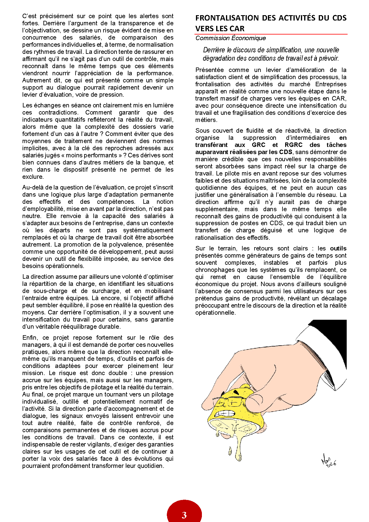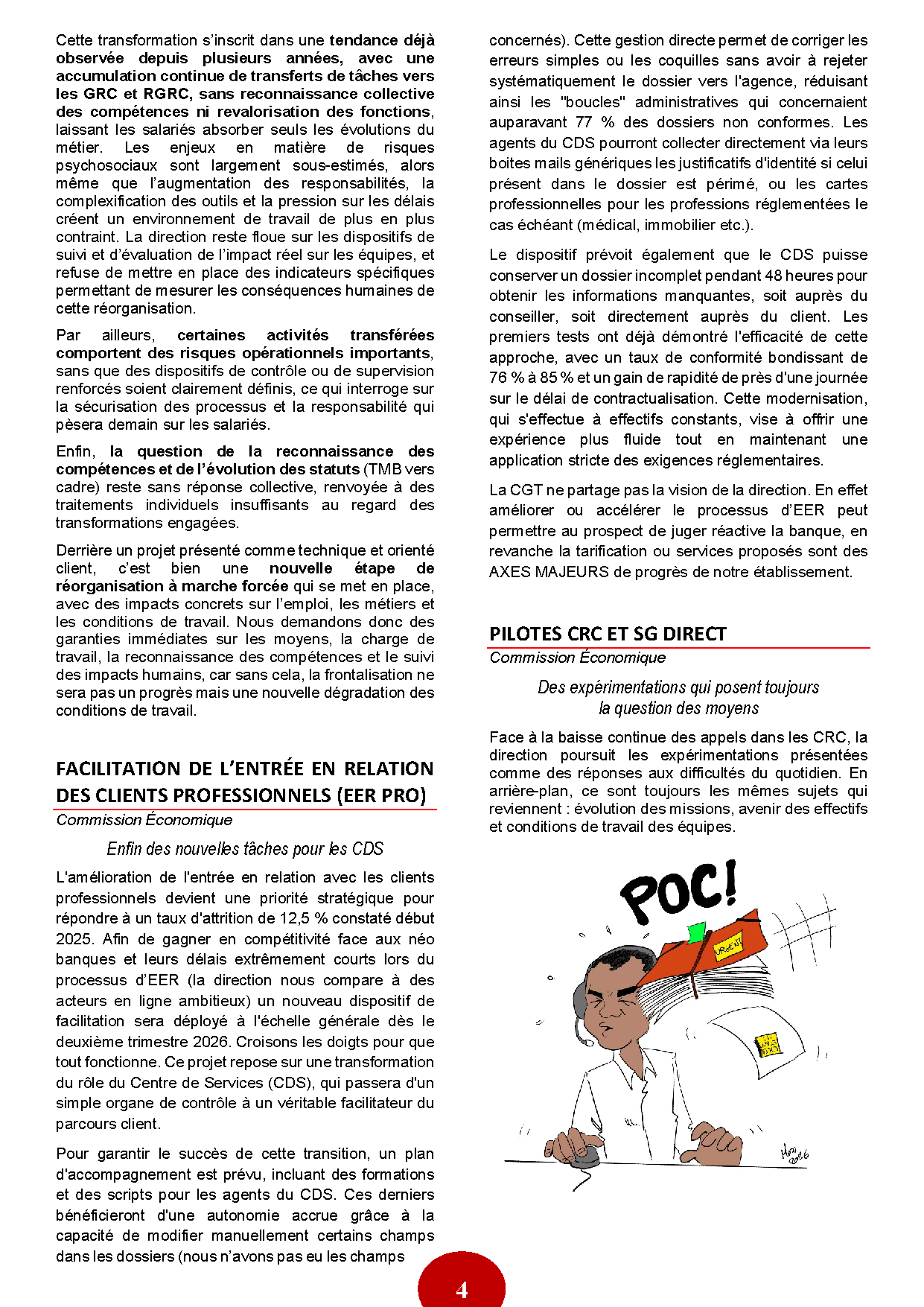 Sous couvert de fluidité et de réactivité, la direction organise la suppression d’intermédiaires en transférant aux GRC et RGRC des tâches auparavant réalisées par les CDS, sans démontrer de manière crédible que ces nouvelles responsabilités seront absorbées sans impact réel sur la charge de travail. Le pilote mis en avant repose sur des volumes faibles et des situations maîtrisées, loin de la complexité quotidienne des équipes, et ne peut en aucun cas justifier une généralisation à l’ensemble du réseau. La direction affirme qu’il n’y aurait pas de charge supplémentaire, mais dans le même temps elle reconnaît des gains de productivité qui conduisent à la suppression de postes en CDS, ce qui traduit bien un transfert de charge déguisé et une logique de rationalisation des effectifs.