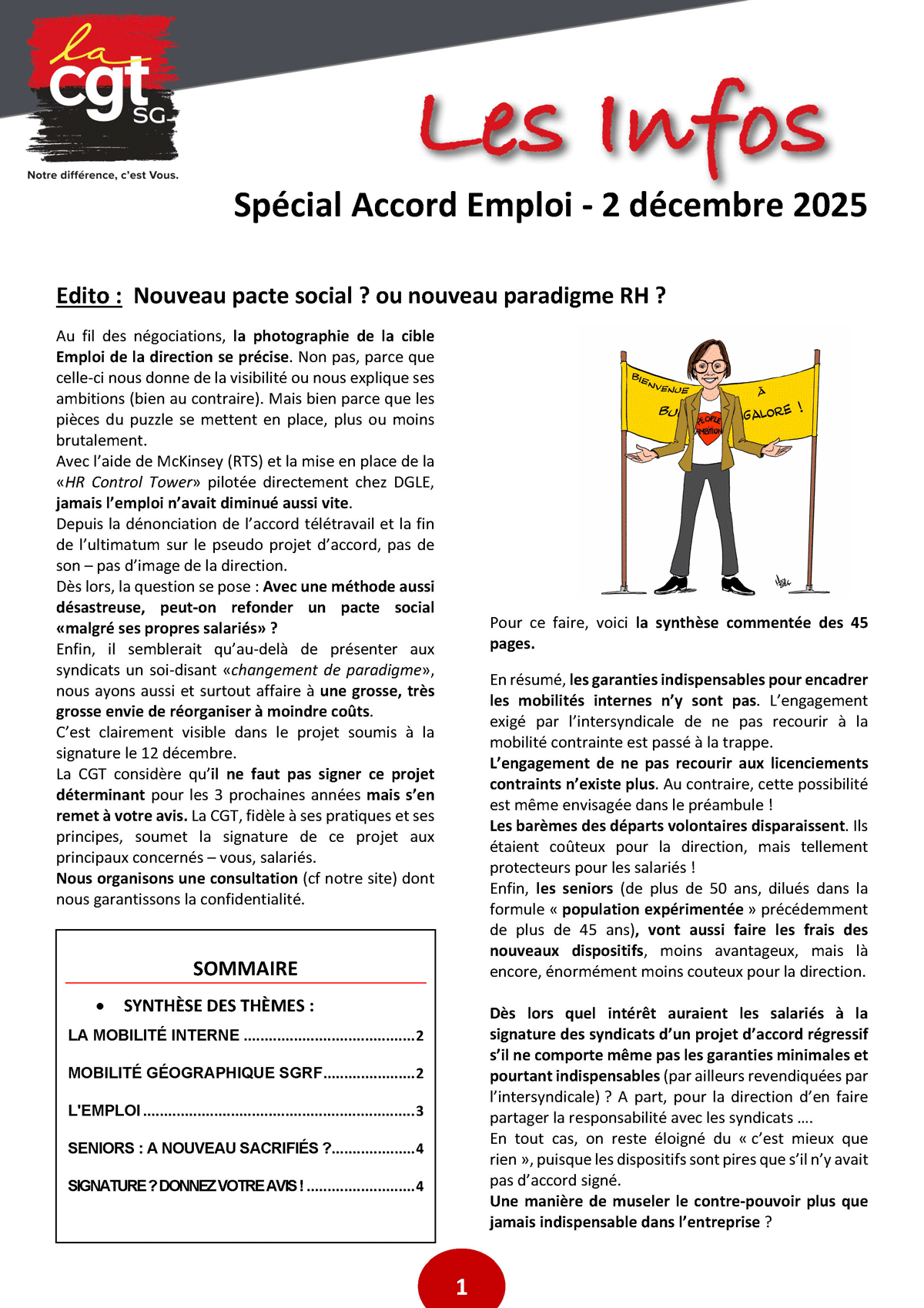 CONSULTATION : MERCI ! Qu’importent les remarques acerbes venant de la direction ou d’ailleurs(«ça n’a pas de valeur», «y’a pas beaucoup de réponses», «de toute façon, ils ne signent jamais», et blablabla), pour la CGT l’avis des salariés qui acceptent de participer à nos consultations est non seulement important, mais surtout déterminant sur notre signature (ou pas) des projets d’accord. En ce qui concerne le projet d’accord Emploi disruptif et régressif proposé par la direction, leur réponse est sans appel : plus de 92% des réponses sont défavorables à sa signature. Cela nous conforte dans notre analyse de la situation et du projet d’accord d’autant que les verbatims qui accompagnent les votes sont souvent encore plus significatifs. Surtout en attendant la publication des résultats du baromètre employeur officiel début 2026 qui, bien que verrouillé au maximum, risque d’être aussi une cuvée historique ! En attendant donc, la CGT ne signera pas cet accord emploi. C’est avec regrets et consternation (mais sans résignation) que nous assisterons à la cérémonie de signature prévue lundi avant la dernière NAO. Ce sera la 1ère fois que la CGT ne sera pas signataire sur l’Emploi à la SG ! Plus globalement, nous sommes signataires des projets d’accords dès qu’ils sont bons et qu’ils sont validés par la consultation des salariés. A la SG, la CGT a ainsi signé jusqu’à présent 69 % des accords (d’autres signent quasiment 100% des projets d’accords). Pour le coup, sur l’emploi, nous espérons que nos craintes seront infondées et nous aimerions que l’avenir nous donne tort. Mais il serait étonnant que la direction fasse valider un projet ultra-régressif pour ne pas s’en servir…