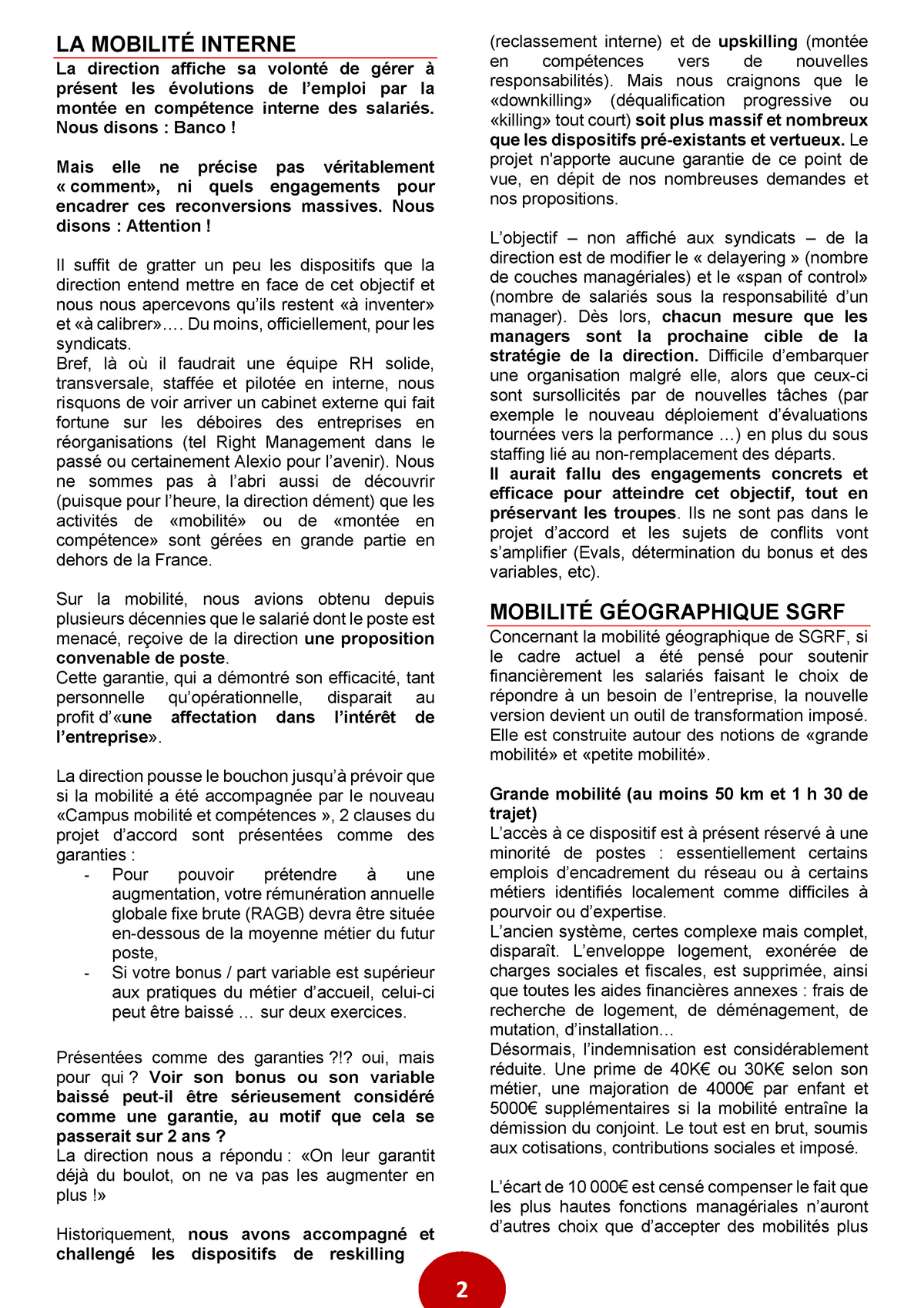 LA MOBILITÉ INTERNE La direction affiche sa volonté de gérer à présent les évolutions de l’emploi par la montée en compétence interne des salariés. Nous disons : Banco ! Mais elle ne précise pas véritablement « comment », ni quels engagements pour encadrer ces reconversions massives. Nous disons : Attention !